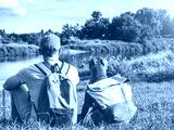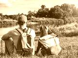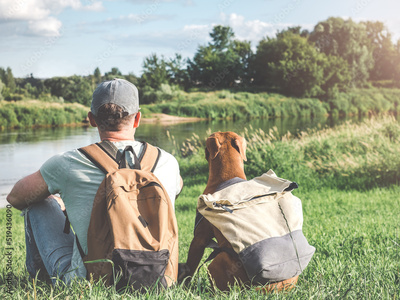 Charming, pretty brown puppy and attractive man. Close-up, outdoors. Day light. Concept of care, education, obedience training, raising pets