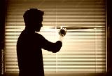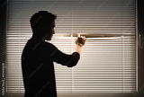 Thoughtful man indoors peaking looking out of his window shutters from a dark room