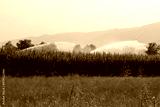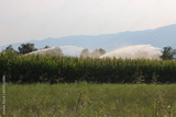 Agricultural irrigation system watering green corn field on sunny summer day in the northern italian countryside with mountains background