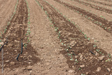 Green cabbages cultivation with drip irrigation system. Cabbages in a row in the field on a sunny day. Brassica oleracea