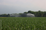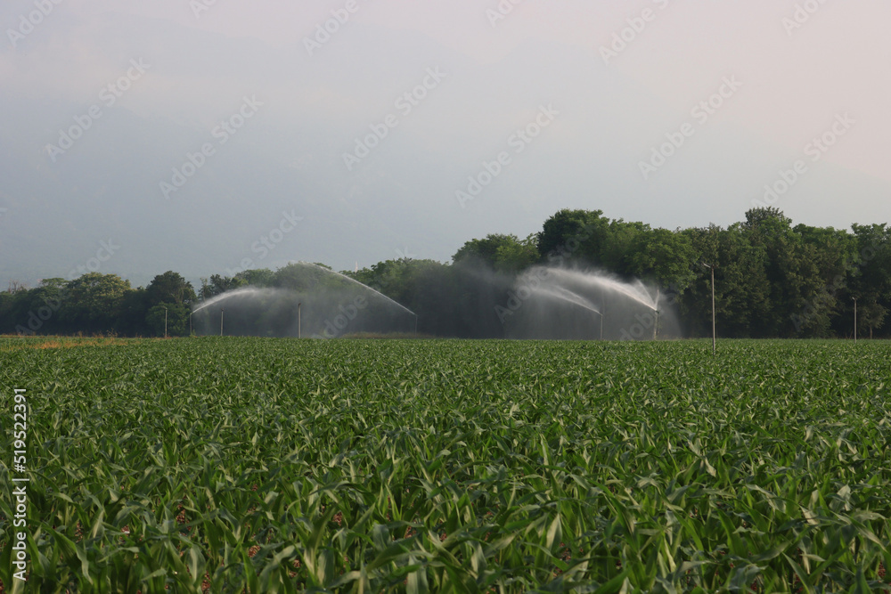 Agricultural irrigation system watering green corn field on sunny summer day in the northern italian countryside with mountains background