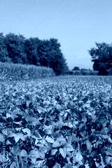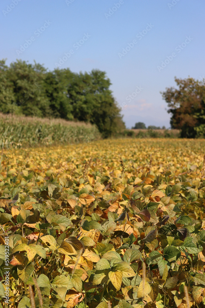 Glycine max agricultural landscape. Yellow and green soybean field on a sunny day