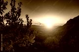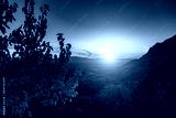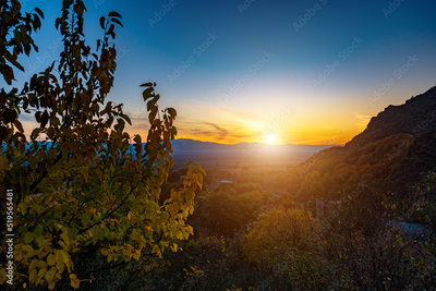 Mountain landscape at sunset. Beautiful sunset sky with mountains in the background