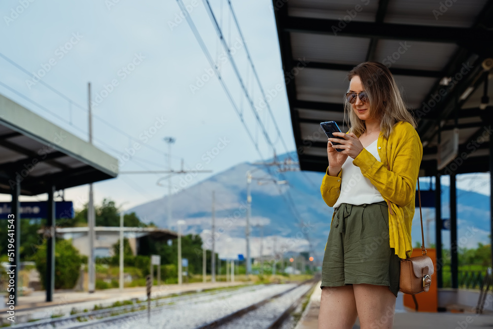 Woman with smartphone is waiting for her train.