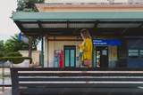Woman with smartphone is waiting for her train.