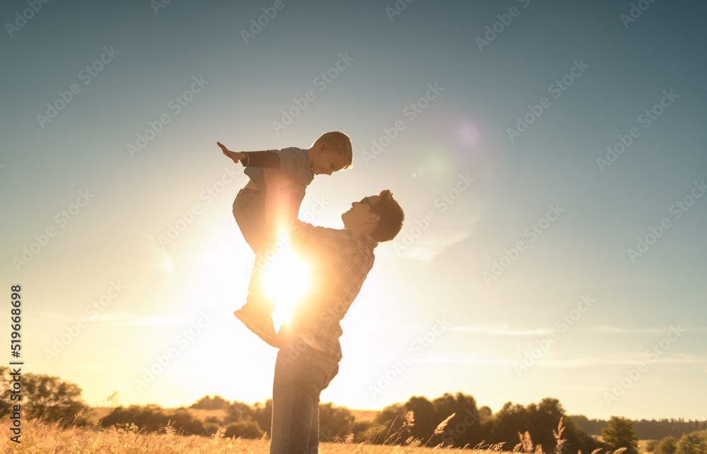 Happy father and son. Father lifting his child up to the sunset sky. Fatherhood, and parenting concept.
