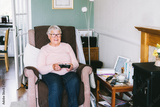 Emotional senior, mature woman looking at tv screen and using wireless controller, joystick gamepad playing video games at home. Fun on Retirement. Gaming hobby. Technology, entertainment industry.