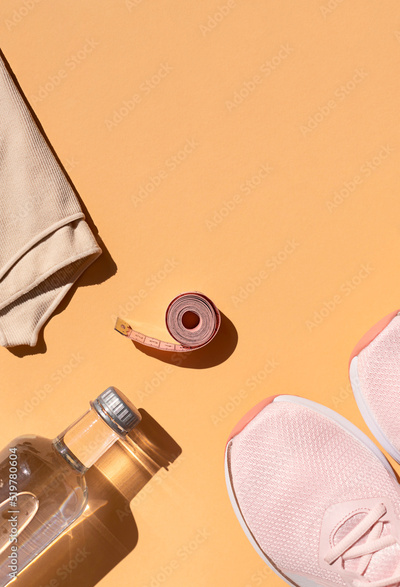 Sport wear or losing weight concept frame with bottle of water and measuring tape on the sunny orange background. Work out top view. Copy space
