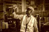 Portrait African American Black afro worker in factory, Cameroon Black man employee work in production plant manufacture factory industry and operator line machine steel metal using helmet for safety