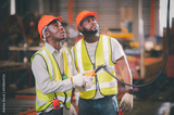 Team African American Black afro worker in factory, industrial engineer wearing helmet while standing in a heavy industrial factory behind. The Maintenance looking of working at industrial machinery