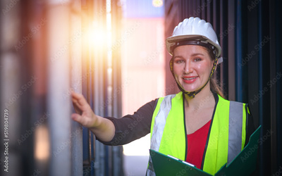 Female Engineer worker woman working checking at Container cargo harbor to loading containers.
