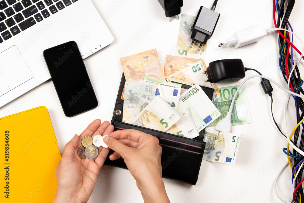 Female hand counting Euro coins from wallet near many electronic devices and power cable cords on white background. Electricity cost and expensive energy concept