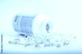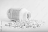 Yellow fish oil capsules in a jelly shell near the white jar. Vitamins and dietary pills supplements. Health concept