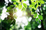 Closeup nature view of green beech leaf on spring twigs on blurred background in forest. Copyspace make using as natural green plants and ecology backdrop