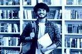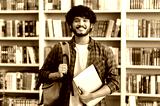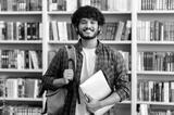 Happy confident indian or arabian male student of university, in stylish casual wear, with backpack and laptop, stands in a library against the background of bookshelves, looks to the camera, smiles