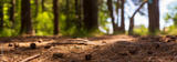 Forest path close-up with cones and roots. Low point of view in nature landscape with strong blurry background. Ecology environment