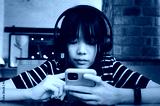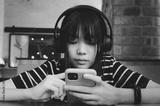 Teenage girl wearing headphones and holding a cell phone smartphone social media relaxing on the sofa.