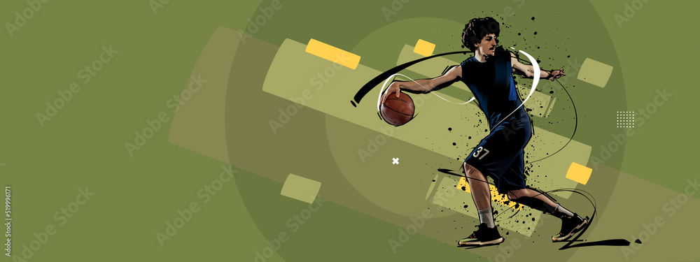 Sport collage with professional basketball player in action, motion with ball isolated on retro colors geometric background. Art, creativity and ad