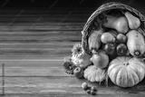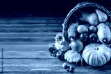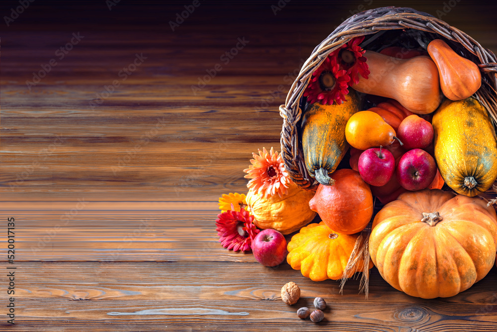 Thanksgiving day still life, background with empty copy space. Pumpkin harvest in wicker basket. Squash, vegetable autumn fruit, apples, and nuts on a wooden table. Halloween decoration fall design