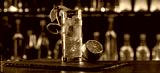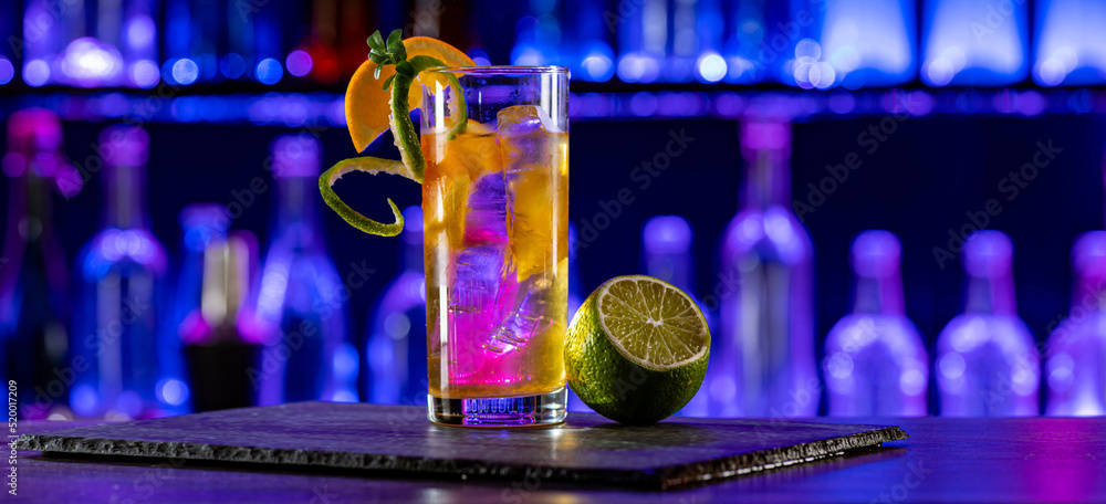 Cocktail iced tea with ice on bar counter in a restaurant, pub. Orange drink with juice. Fresh prepared alcoholic cooler beverage at nightclub. Showcases with bottles on dark background