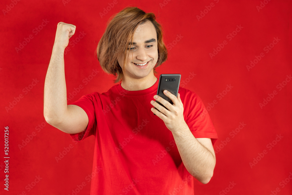 Young man Prep Student with long hair. 20s guy with smartphone on a red background