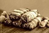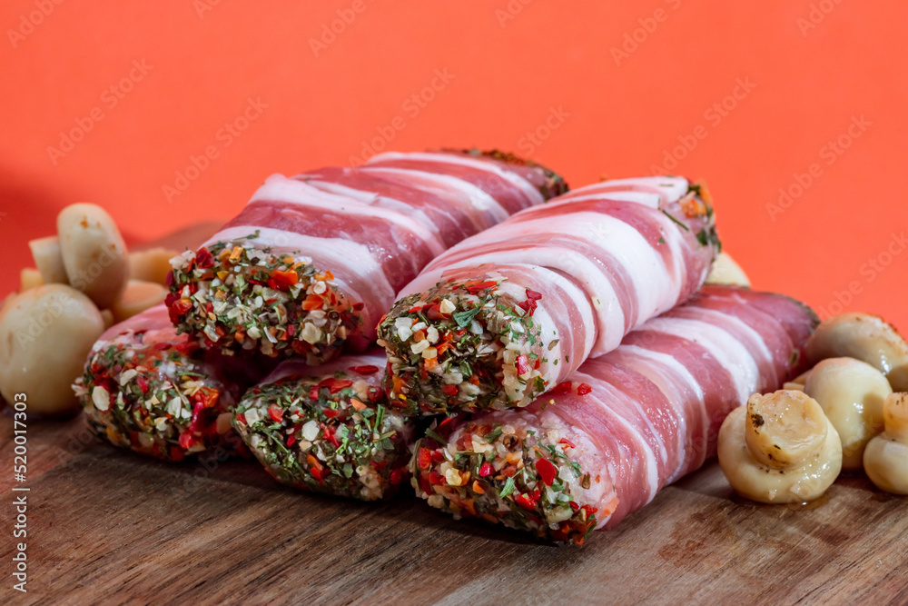 Bacon-wrapped meat roll with spices and herbs. Jamon pork, prosciutto, or presunto meat products, tartare meat inside. Meatloaf close up high focus view with shallow depth of field on a wooden board