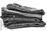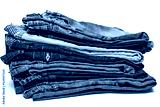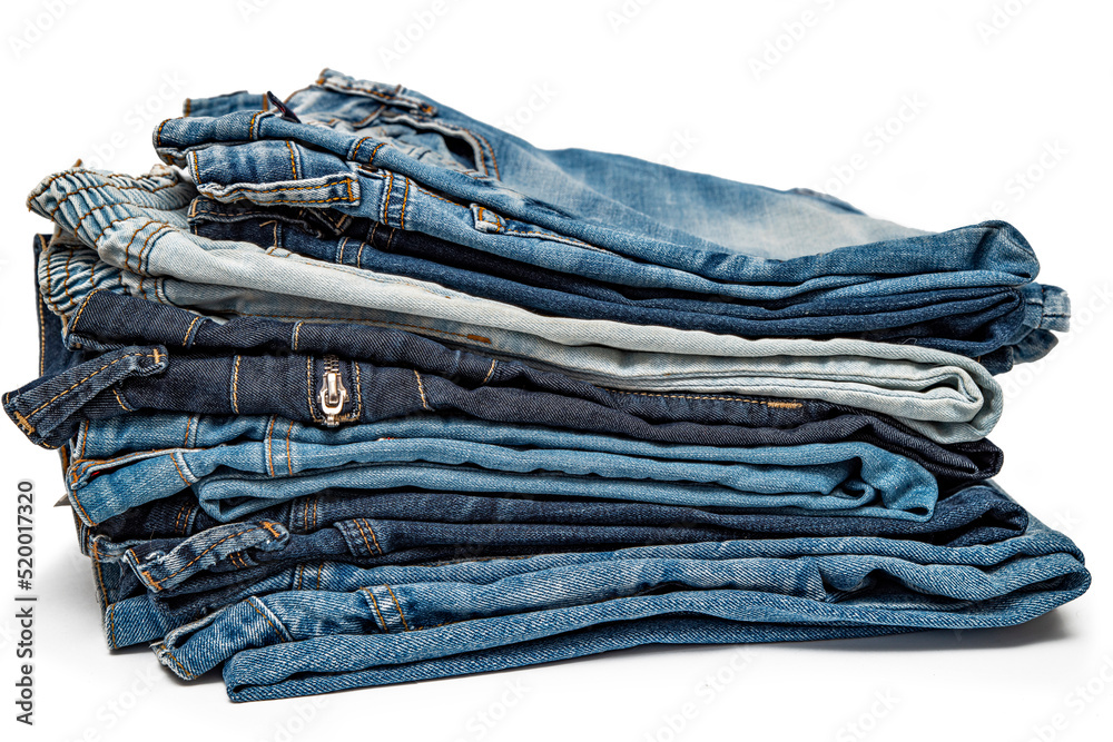 Various blue jeans pants or trousers made of blue-colored denim cloth. Closeup abstract texture cotton fabric for background design. Pair of jeans, pockets, rivets, buttons, seams