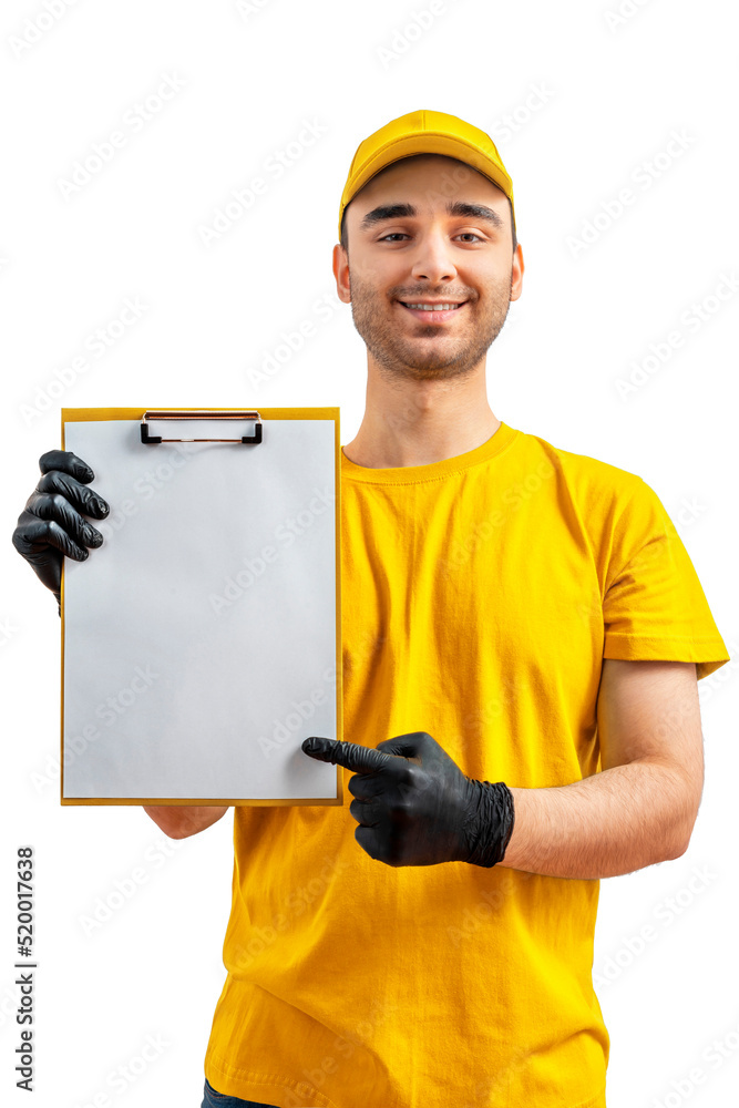 Delivery man with clipboard. Courier in uniform cap and t-shirt, gloves service fast delivering orders. Young guy holding a cardboard package. Character on isolated white background