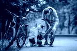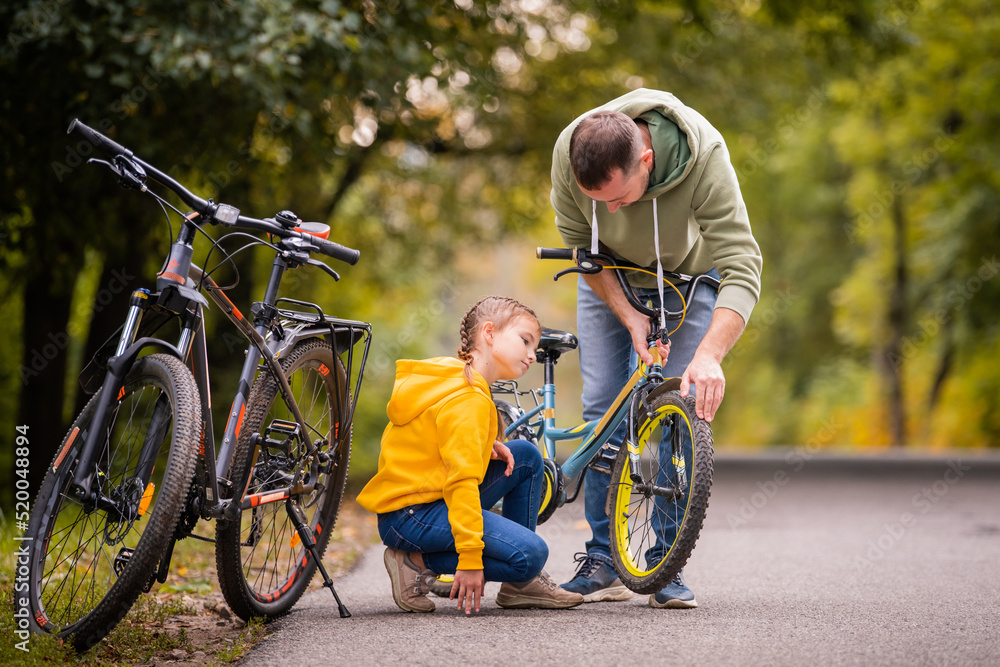 Dad and daughter inspect wheel of children's teenage bicycle on the autumn path of the park.