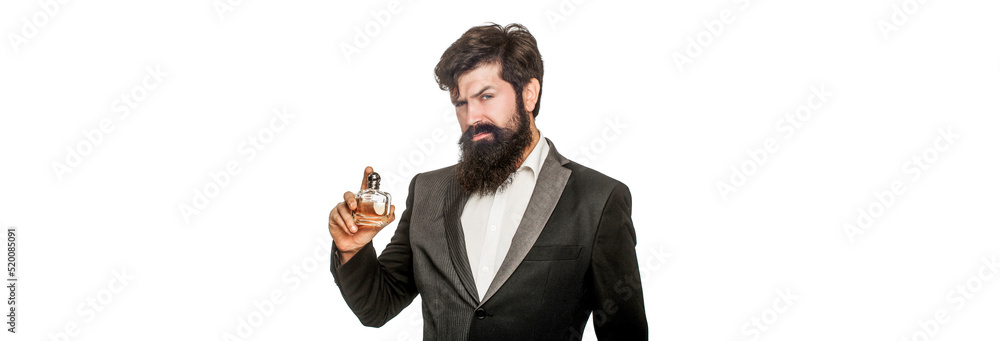Perfume or cologne bottle and perfumery, cosmetics, scent cologne bottle, male holding cologne. Masculine perfume, bearded man in a suit. Male holding up bottle of perfume