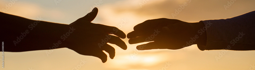 Rescue, helping gesture or hands. Two hands silhouette on sky background, connection or help concept. Outstretched hands, salvation, help silhouette, concept help. Giving a helping hand