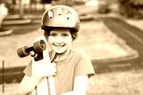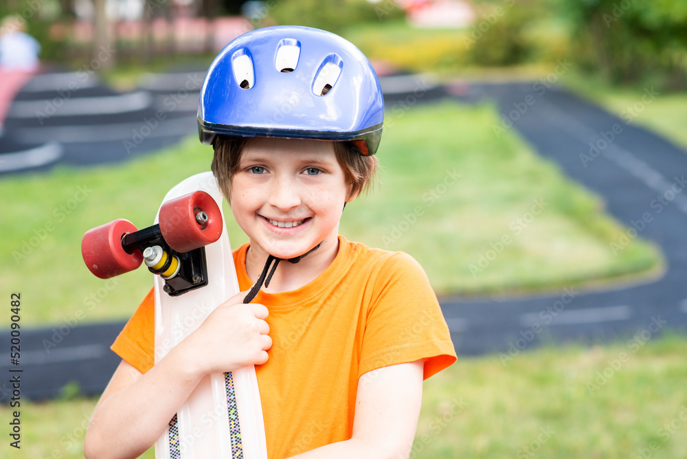 happy schoolboy in a protective helmet holds a skateboard with his hands, a skateboard in the summer outside