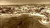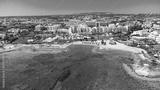 Aerial bird's eye view Pernera beach Protaras, Paralimni, Famagusta, Cyprus. The tourist attraction golden sand bay with sunbeds, water sports, hotels, restaurants, people swimming in sea from above.