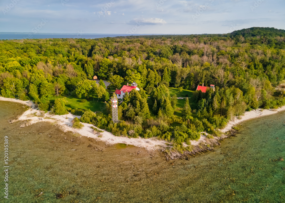Aerial view of Leelanau state park, and Historic Grand Traverse lighthouse in Michigan .