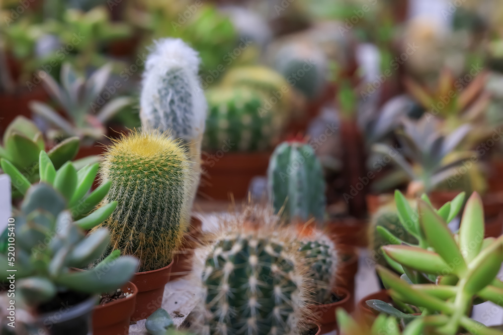 Several cactus plant up for sale at nursery ,close up shot.