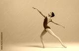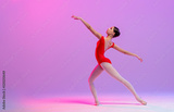 Beautiful young ballerina on a white background. The ballerina is dressed in a red leotard, pink leotards, pointe shoes.