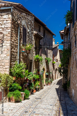 Beautiful medieval street with flowers and plants in the historic center of Spello, Umbria Italy