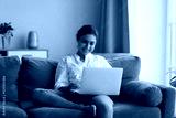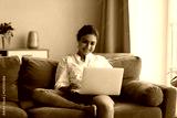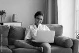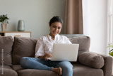 Cheerful young Indian freelance employee woman using online app on laptop, working at computer, relaxing on sofa at home, talking on video call, smiling, laughing. Communication concept