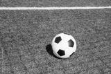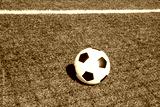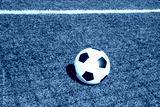 Football soccer sport background. Green artificial turf soccer field with white line, shadow from football goal net and soccer ball on sunny day outdoors. Top view