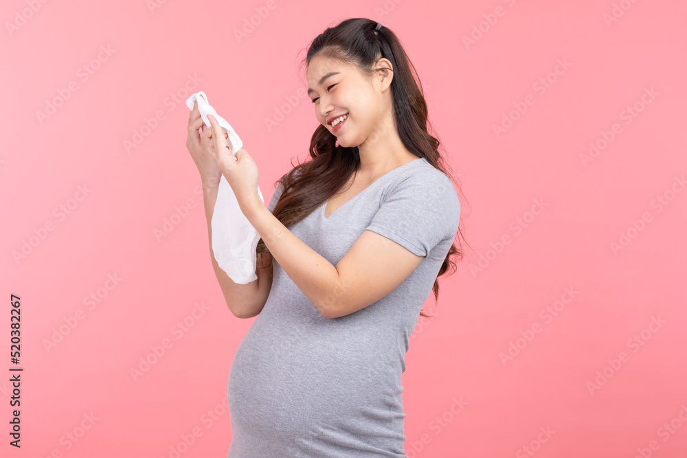 Asian pregnant woman holding baby cloth for baby newborn isolated on pink background. Pregnant woman packing baby stuff ready for the maternity hospital. Pregnancy Proud Prepare for Newborn Concept