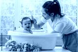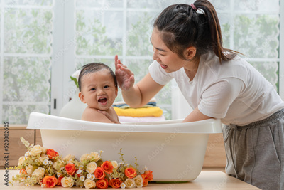 Calm asian baby bathing in bathtub enjoy laughing. mother bathing her son in warm water.Happy adorable newborn infant smile in tub relax and comfortable good moment with mom. Newborn baby care concept