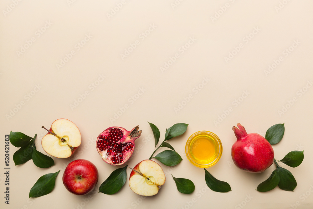 Flat lay composition with symbols jewish Rosh Hashanah holiday attributes on colored background, Rosh hashanah concept. New Year holiday Traditional. Top view with copy space