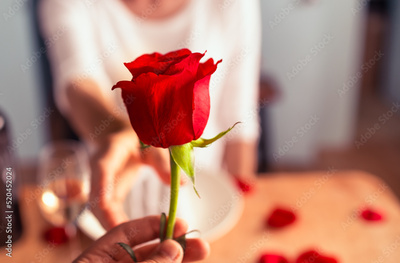 Man giving woman a red rose. Romantic gift on a dinner date.