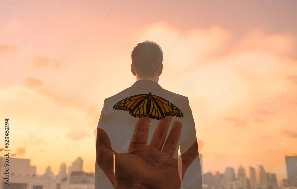 Man feeling free spreading his wings learning to fly. People with feelings of hope and peace concept.