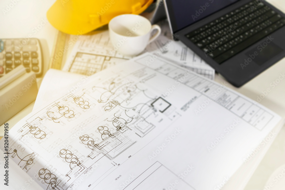 Construction business using plans for electrical systems, energy,Plans and work tools, laptops, calculators, helmets