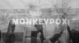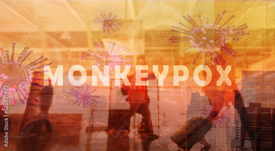 Monkeypox outbreak and travel concept. Monkeypox is caused by monkey pox virus. Tourists with baggage walking in the airport. Travel during virus outbreak. Monkeys may harbor virus and infect people.