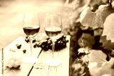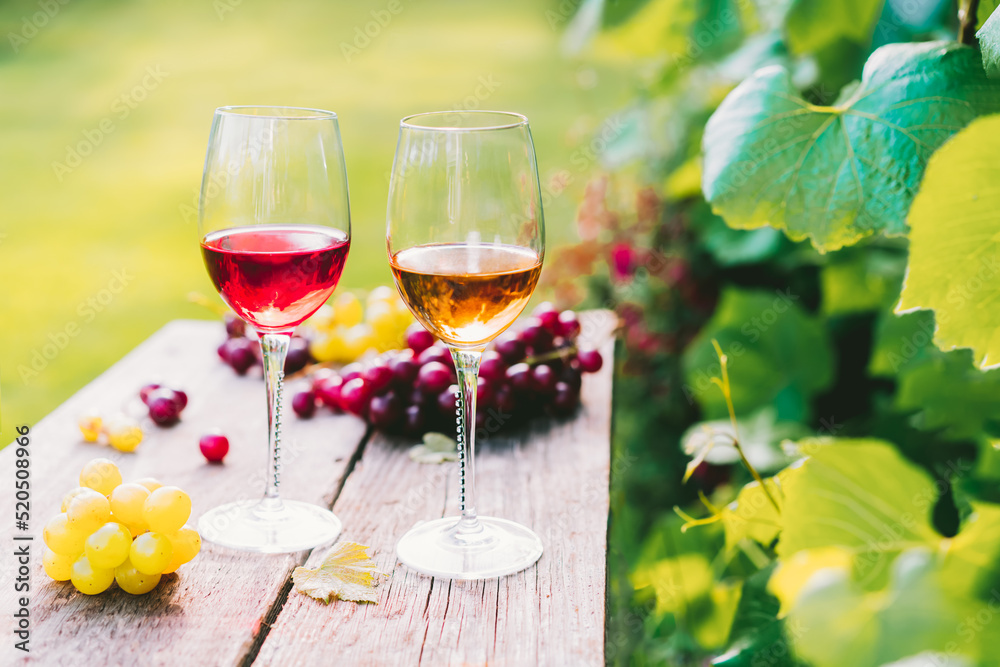Glasses with white and red wine and grape berries on the wooden table in the vineyards, winery with green leaves background in sunset light. Wine tasting, Degustation. Selective focus, Copy space