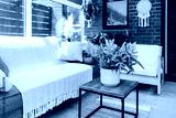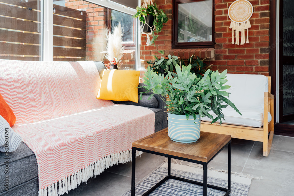 Cozy, light conservatory interior design with gray sofa decorated with bright textile cover and cushions and many green house plants. Hygge home interior design. Biophilic lifestyle. Selective focus.