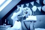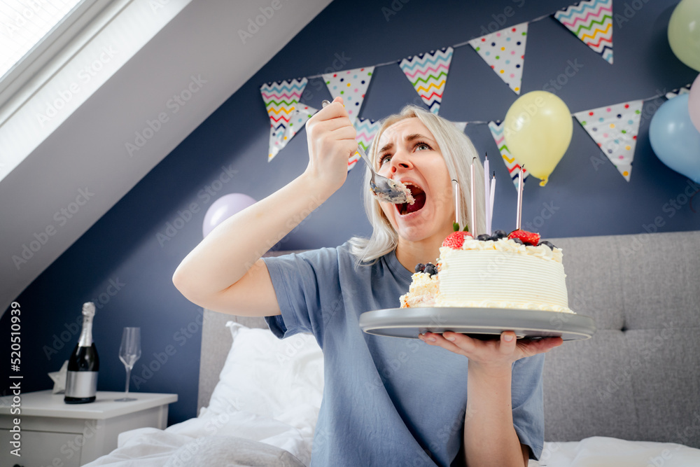 Sad, upset woman in pajama and party cap eating by spoon her birthday cake sitting on the bed in decorated bedroom. Celebrates birthday alone. Jamming of negative emotions. Selective focus.
