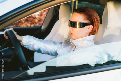 Fashion cyberpunk girl drive a supercar. Red hair woman with futuristic eyeglasses sits by the car steering wheel. Future technology concept. Selective focus, copy space.